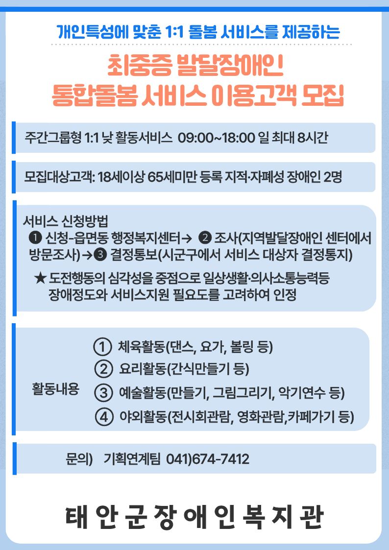 최중증 발달장애인 통합돌봄 고객 모집 복지관 0 10 5시간전 최중증 발달장애인 통합돌봄 서비스 고객을 모집합니다.최중증 발달장애인은 지적장애나 자폐성 장애 등 발달장애의 정도가 매우 심해, 일상생활 전반에서 상시적·전면적인 지원이 필요한 사람을 말합니다.