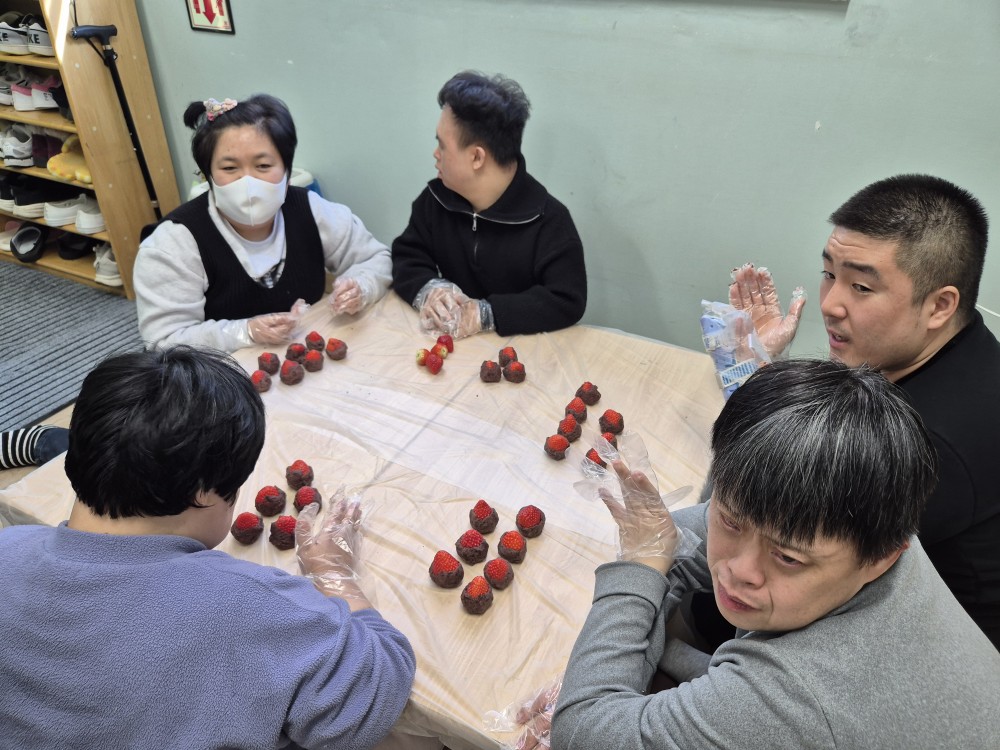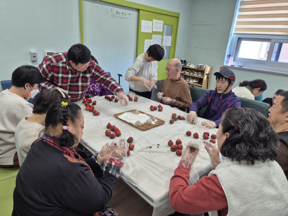 주간보호 사업 "원데이클래스-딸기찹쌀떡만들기" 가족문화지원팀송수화 0 7 3시간전 주간보호 사업으로 "딸기 찹쌀떡 만들기" 체험 활동을 진행하였습니다!강사님이 직접 오셔서 진행을 하고 반죽을 스스로 만지고 딸기를 감싸면서감각을 자극시키면서 소근육이 발달이 되고, 기분전환이 되면서 자기 만족감 및 효능감을 증진하면서 즐거운 시간을 보냈습니다 ^ ^