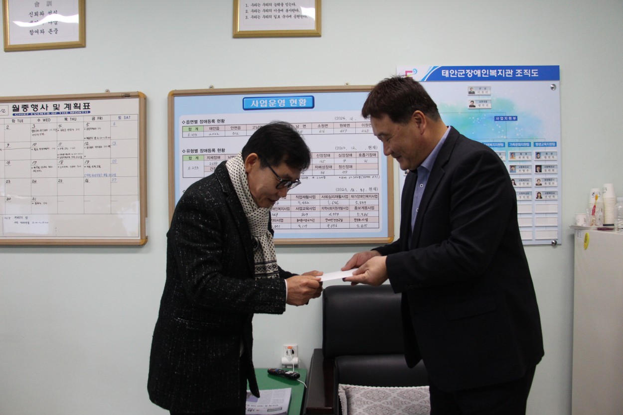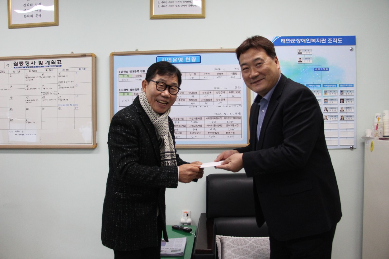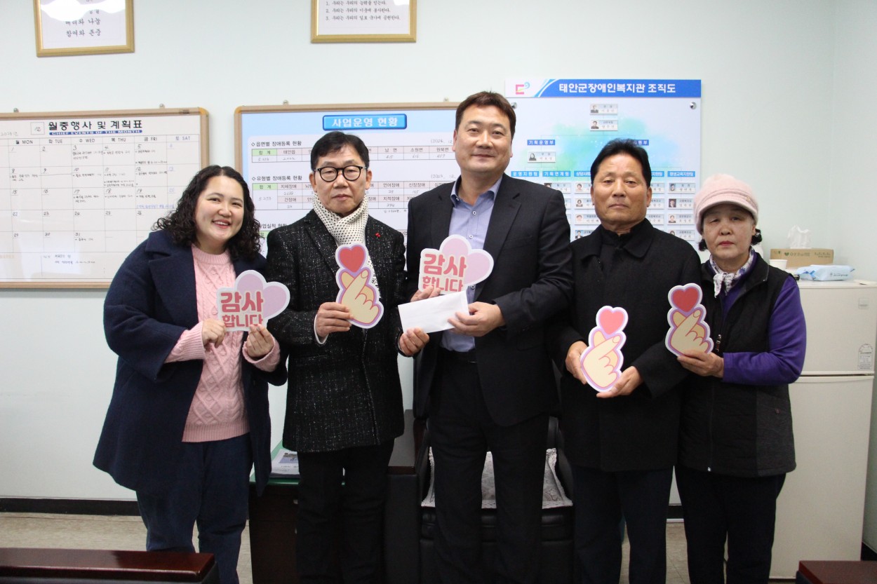 후원금 전달(동문사리 이장 이승선님, 강성건설 강성민대표, 동문4리 개발위원회, 새마을 남녀지도자) 복지관 0 14 12.11 10:15 태안읍 동문4리 이장 이승선, 강성건설 강성민 대표, 동문4리 개발위원회, 새마을남녀지도자는 12월 4일 태안군장애인복지관(관장 이종만)에 방문하여 중증장애인 낮보호 서비스 주간보호 고객들을 위해 사용해 달라며 기부금 100만원을 전달해 주셨습니다.이번 후원금은 동문4리 이장님과 주민들이 한 해 동안 자원재활용품을 모아 판매해 마련한 소중한 기금으로, 지역 공동체가 장애인 복지 향상을 위해 후원금을 전달해 주셨습니다.전달해주신 모든 분들께 진심으로 감사드립니다. 기부금은 주간보호 고객들의 프로그램등에 사용 될 예정입니다
