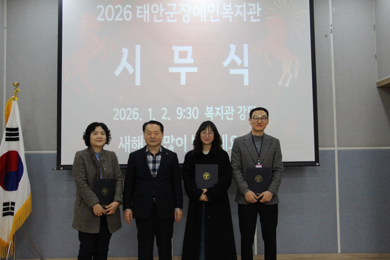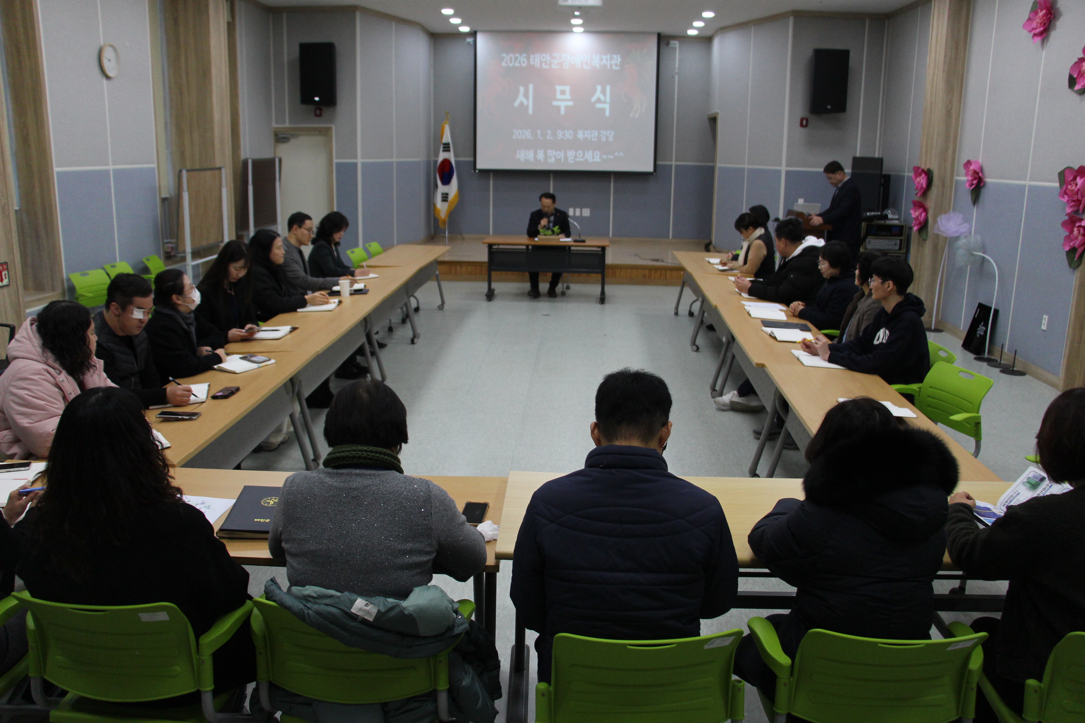 2026년도 복지관 시무식 복지관 0 24 01.07 17:16 2026년 병오년 새해를 맞아 이종만 관장님의 따뜻한 신년사와 함께 새로운 변화를 알리는 인사이동 임명장 수여식으로 힘찬 첫 발걸음을 뗐습니다. 관장님과 전 직원이 한자리에 모여 서로의 건강과 행복을 비는 덕담을 나누며, 지역사회를 향한 우리의 사명을 다시 한번 마음 깊이 되새겼습니다. 활기찬 에너지로 가득했던 시무식의 현장처럼, 올 한 해도 태안군 장애인 이웃들과 함께 희망을 만들어가는 복지관이 되도록 최선을 다하겠습니다~~^^