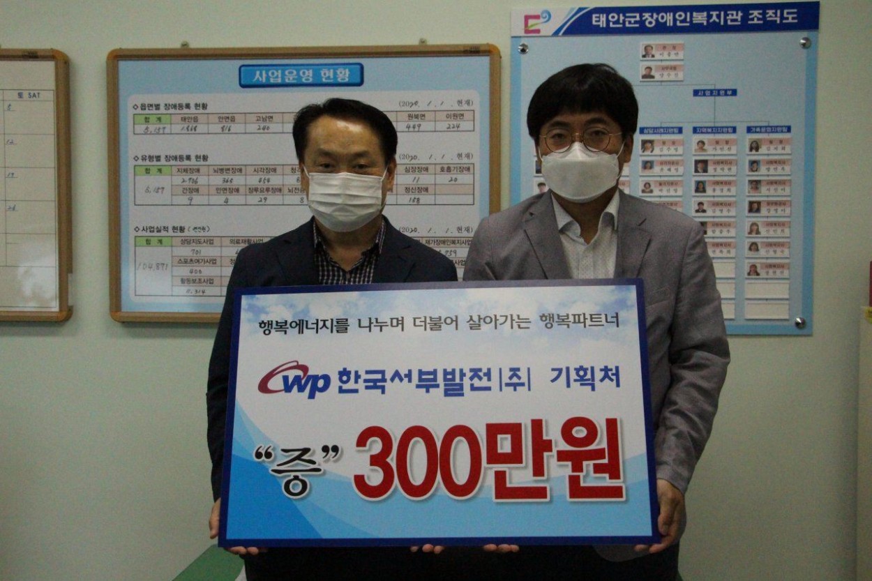 한국서부발전(주) 장애인복지관에 사랑의 상품권 전달 조항수 0 1466 2020.09.25 16:09 태안군장애인복지관(관장 이종만)은 지난 11일 민족고유의 명절 추석을 앞두고 한국서부발전(사장 김병숙)이 방문하여 후원물품 전달식을 가졌다고 밝혔다. 이날 후원받은 물품은 경제적으로 어려움을 겪고 있는 장애인을 위해 써달라며 태안사랑 상품권 300만원을 전달했다.