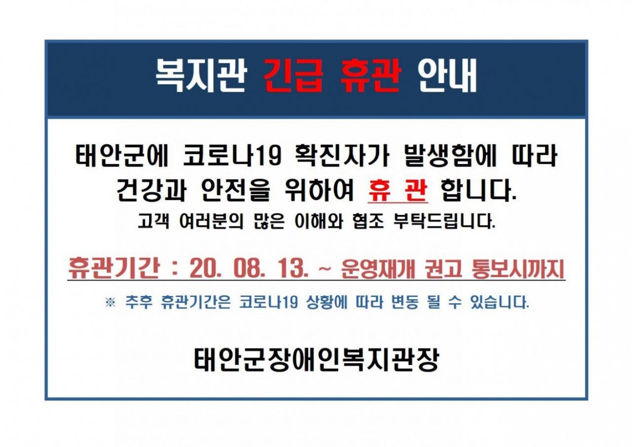 태안군 코로나19 확진자 발생으로 인한 휴관