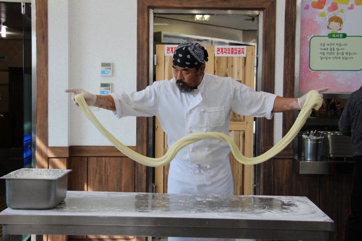 사진설명 : 수타명가 지흥선 대표가 수타 장인답게 현장에서 직접 수타면을 뽑는 시연을 함께 선보여 고객들에게 큰 호응을 얻고 있다.
