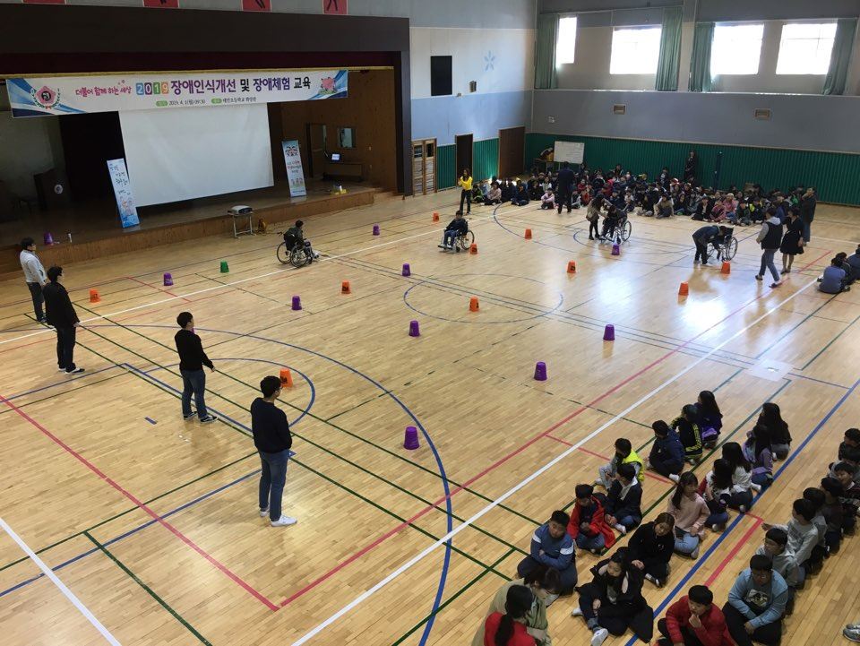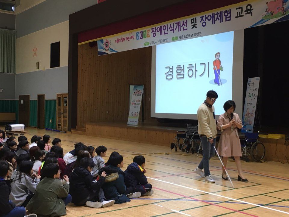 가장 먼저 실시한 장애인식개선교육은 희망 학교의 사전 접수를 통해 각 학교에 방문하여 동영상과 PPT 자료를 활용하여 ‘장애의 이해’ 교육과 ‘장애 체험’ 교육으로 학생들의 눈높이에 맞춰 4월 1일부터 6회기로 나누어 태안초등학교 ( 3회기, 전교생 470명), 백화초등학교 (2회기 2~3학년 270명), 태안고등학교 (전교생 430명)의 1,200여명의 학생과 교사를 대상으로 진행하고 있다.