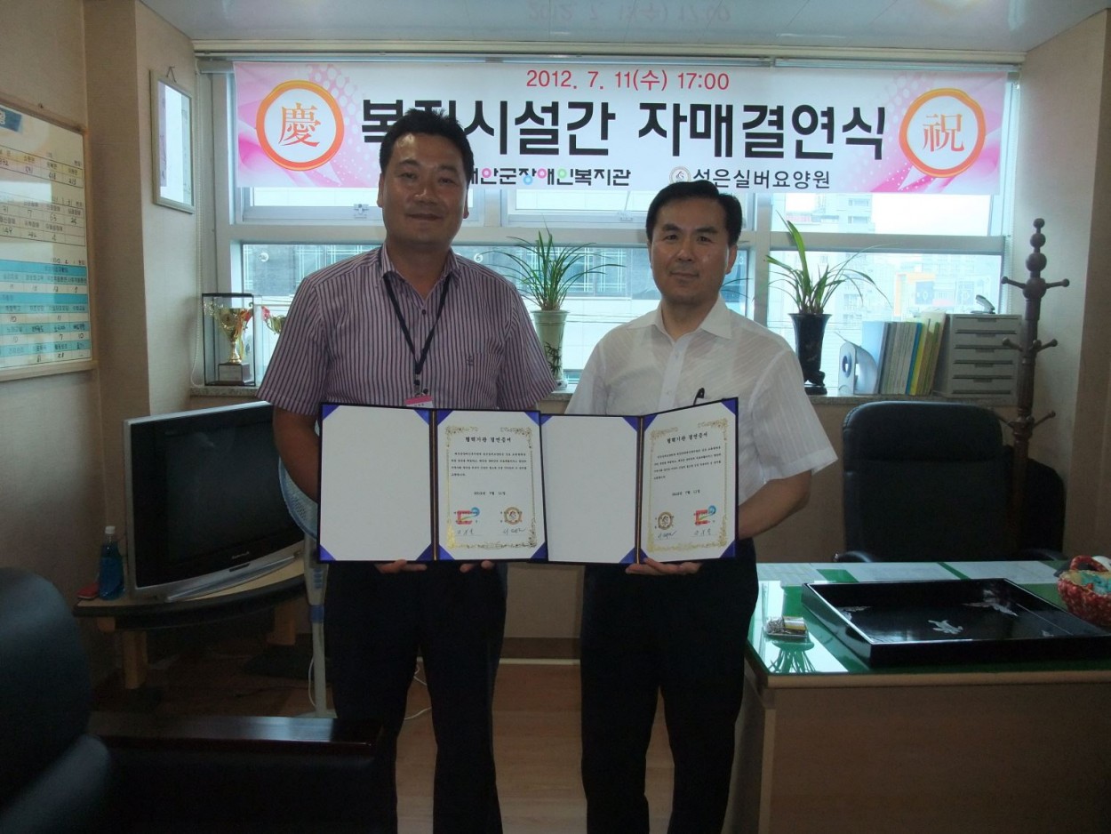 지역사회복지시설간 자매결연식 박효성 0 2118 2012.07.17 15:01 태안군장애인복지관(관장 직무대행 양수진)은 지역의 복지시설 성은 실버요양원(원장 서재건)과도 자매결연식을 갖고 장애인의 의료재활서비스 향상과 지역사회발전을 위한 긴밀한 상호 교류 협력을 가질 것을 약속했다.