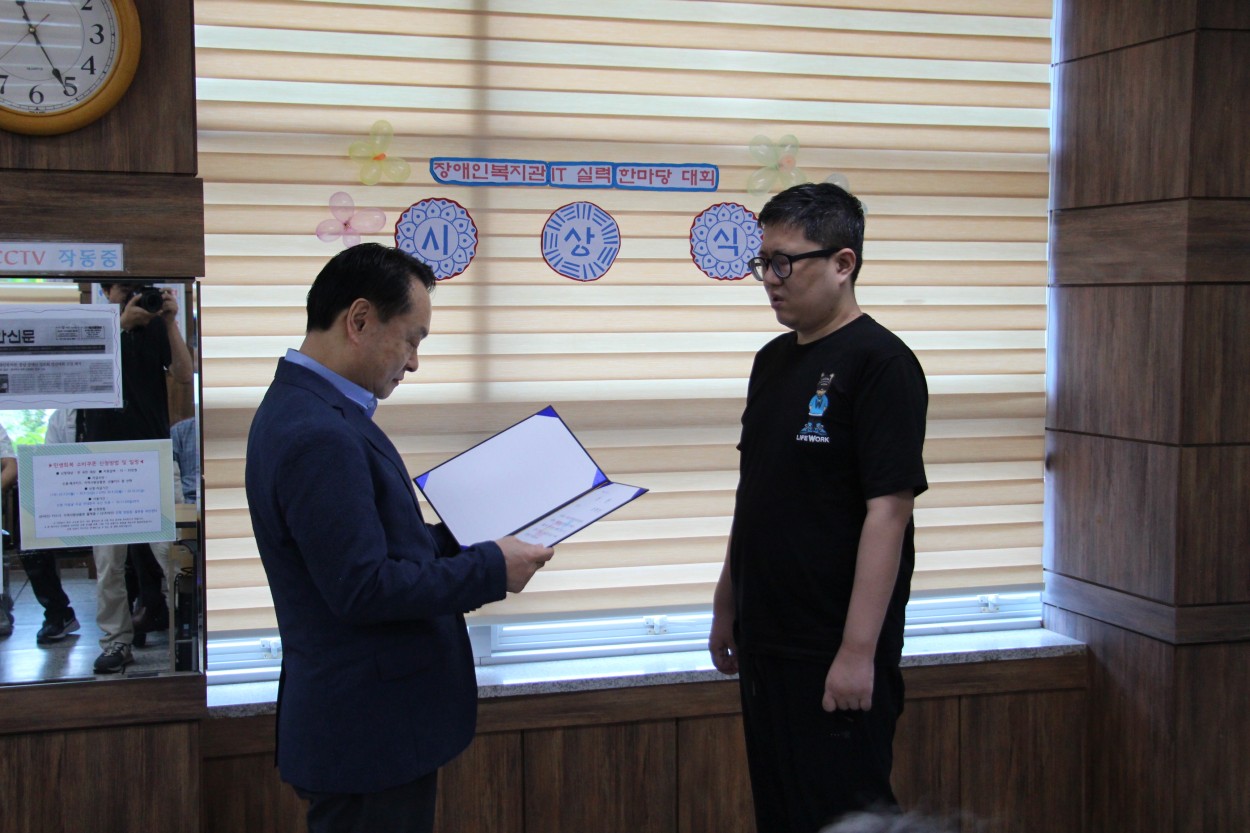 7월 16일(수) 정보화교육에 참여하는 프로그램 참여자들(10명)이 장애인복지관 자체 IT실력 한마당대회에 참가하였다. 참가를 통해 자신감과 성취감을 고취시키고 자립과 정보격차를 해소하기 위한 대회였으며, 대회 시작전 모두 화이팅하며 마음을 다잡고 대회에 참여하는 모습도 보여 주었다. 7월 23일(수) 열심히 대회에 참여한 이용자들의 시상식이 있었으며, 시상은 장애인복지관장 이종만 관장님께서 시상해 주어 더 뜻깊은 시간으로 대회를 마무리 할 수 있었다.