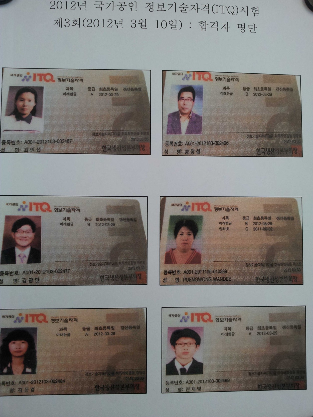 정보화교실에서 ITQ자격증을 취득했습니다. 강영미 0 2737 2012.05.11 13:26 저희 복지관 정보화교실에서는 자격증에 도전하여 3월 10일에 6명이 합격을 했고 4월 14일에는 4명이 합격을 하였습니다. 그리고 내일 5월 12일 토요일에 또 시험보러 4명 갑니다.