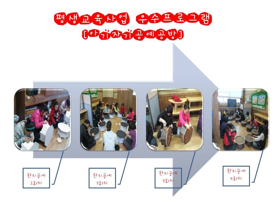 평생교육지원사업 우수프로그램[아기자기공예공방] 가민선 0 2063 2011.04.14 16:36 2011년도 태안군에서 지원하는 평생교육지원사업이 3월말부터 시작하였습니다. 지금 한지공예[팔각大상]를 4회기 진행중에 있습니다.