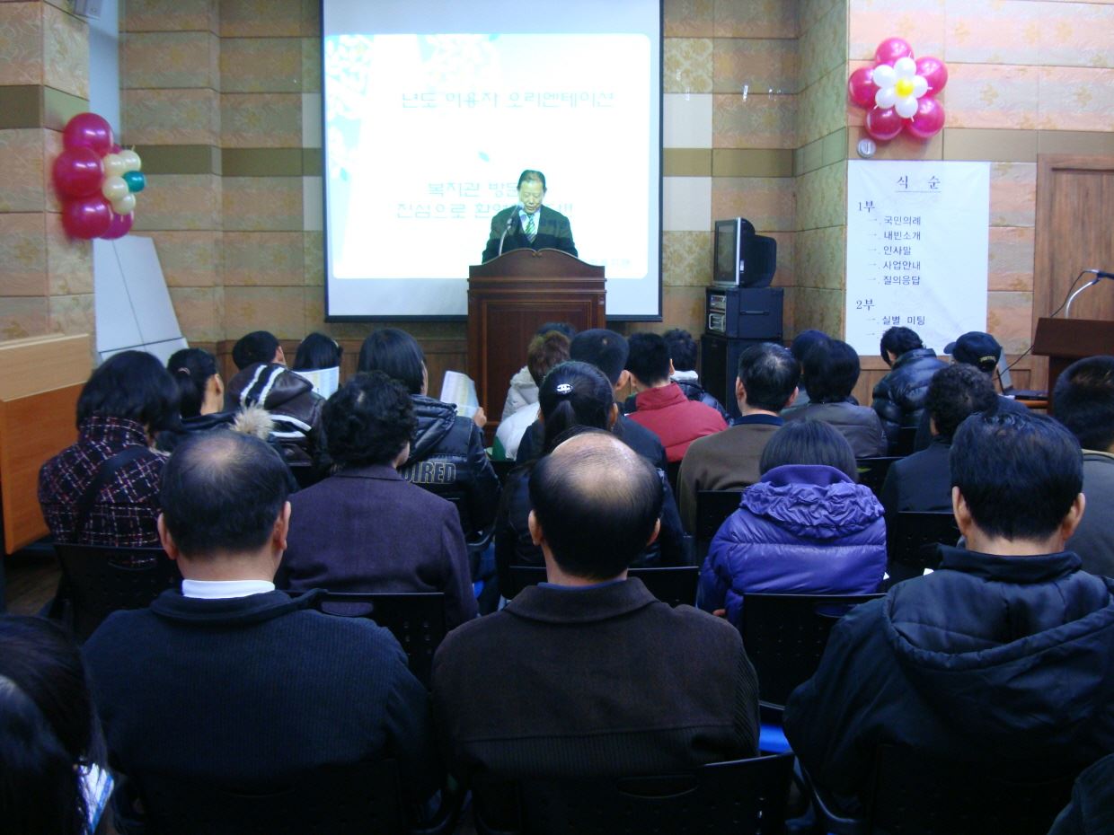 2010년도 이용자 오리엔테이션 개최 총무기획팀 0 2327 2010.02.26 15:13 지난 2월 25일(목) 10시부터 13시까지 복지관에서 2010년도 이용자 오리엔테이션을 개최하였습니다. 비가 오는 궂은 날씨에도 많은 고객분과 가족분들이 참여해주셔서 즐거운 시간을 보냈습니다. 본 행사는 2009년도를 마감하고 새로운 2010년도를 맞이하고자 복지관 사업 및 이용방법 등을 알리는 자리였습니다. 고객과 가족분들 앞에서 약속드린것처럼 모든 직원이 열심히 노력하여 발전하는 복지관을 보여드리도록 하겠습니다. 항상 변함없는 관심과 사랑에 진심으로 감사드립니다.