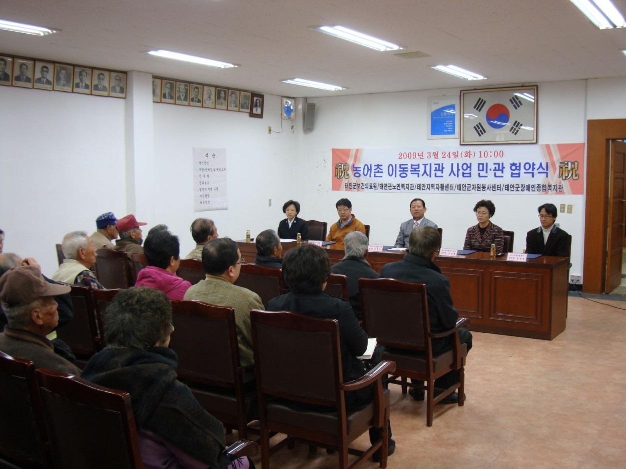 농어촌 이동복지관 민관협약식 체결 가민선 0 2444 2009.03.25 17:16 본 복지관(관장 조해상)은 민관협력기관(태안군보건의료원, 태안군노인복지관, 태안군자원봉사센터, 태안지역자활센터)을 구축하여 2009년 3월 24일 안면읍사무소에서 협약식을 체결하였다.