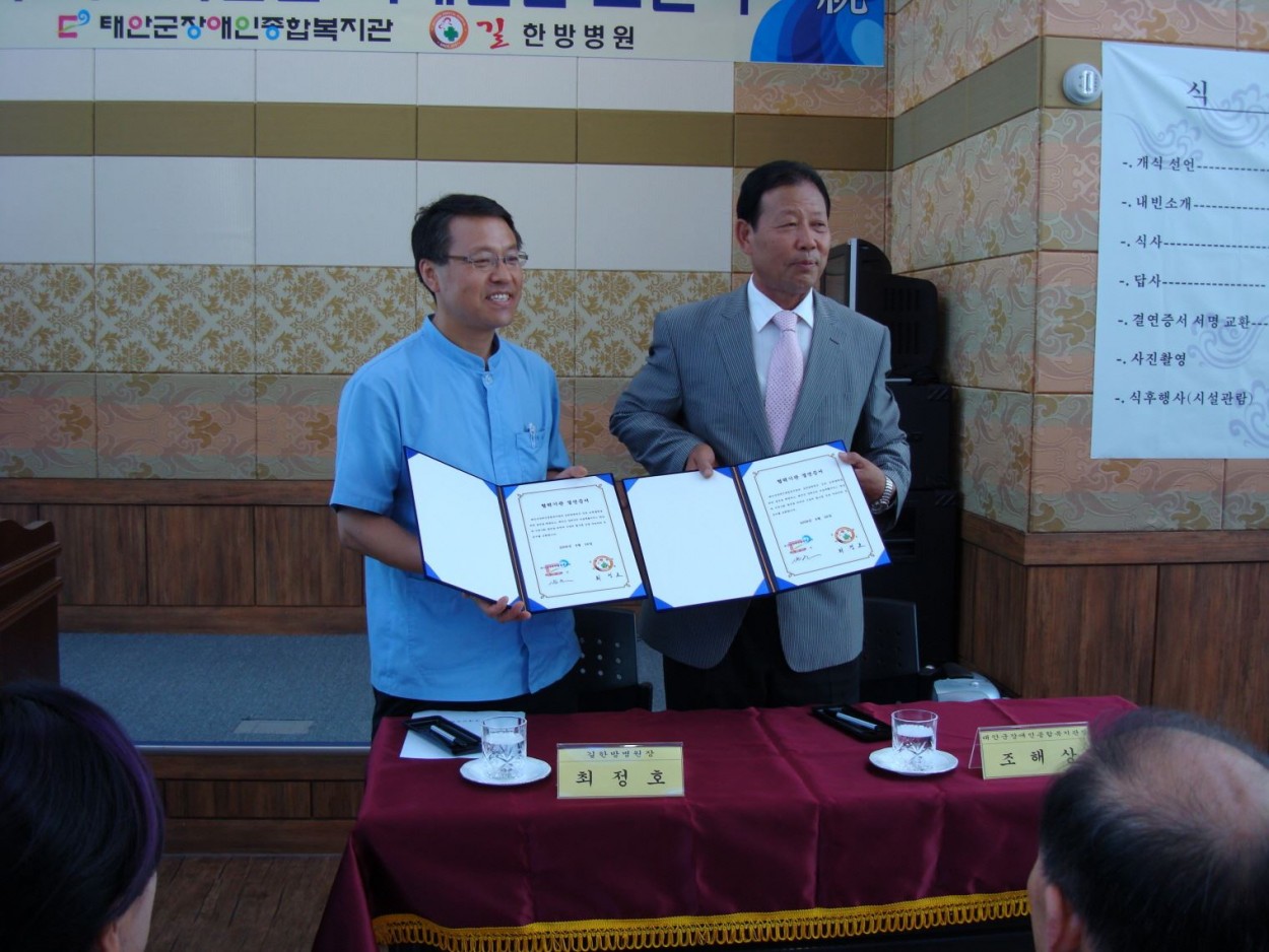 장애인복지관-길한방병원 자매결연 체결 총무기획팀 0 2499 2008.08.28 14:50 지난 8월 27일(화) 13:30, 본 복지관 강당에서 복지․의료시설간 자매결연 체결식이 진행되었다. 복지관 이용고객 및 관계자 30여명이 참석한 가운데 길한방병원 최정호 병원장님과 태안군장애인종합복지관 조해상 관장님은 자매결연을 통해 상호협력 및 전문화 된 장애인 의료서비스를 제공하여 지역장애인의 재활기회 확대 및 삶의 질 향상을 위해 노력하기로 약속하고, 증서를 교환하였다. 태안군장애인의 의료사업활성화에 양 기관이 이바지할수 있도록 많은 격려 부탁드립니다.