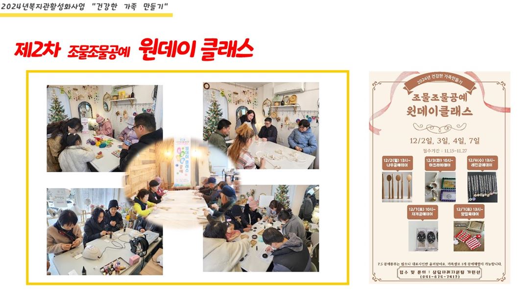 2024 복지관 활성화사업 "건강한 가족 만들기" 상담사례지원팀가민선 0 1008 2024.12.10 10:34 2024년 복지관 활성화사업 "건강한 가족만들기"를 마무리 하였습니다.제1차는 '뛰고보고놀고'라는 주제로 삽교호 가을나들이를 10월 29일에 다녀왔으며 제2차는 '조물조물공예'라는 주제로 장애인 및 가족이 다함께 다양한 공예체험을 할 수 있도록 12월 첫째주에 원데이 클래스를 진행하였습니다.내년에도 건강한 가족을 만들기 위해 다양한 프로그램으로 찾아뵙겠습니다.