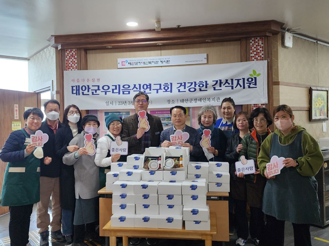 태안군우리음식연구회, 태안군장애인복지관 고객들에게 간식 후원 기획연계팀함종우 0 1320 2023.03.16 11:32 3월 15일 태안군우리음식연구회(회장 김경희/이하 우리음식연구회)는 태안군장애인복지관에 방문하여 100여 명의 장애인에게 간식 후원 및 배식 봉사활동을 진행하였습니다.우리음식연구회는 농업기술센터에 소속되어 우리음식에 관심이 많고 솜씨가 뛰어난 사람들이 모여 지역특산물을 이용한 요리개발과 전통식문화의 맥을 이어나가고자 하는 연구모임이다. 우리음식연구회는 앞으로도 태안군장애인복지관에 지속적인 봉사활동을 하겠다는 뜻을 전하였다.
