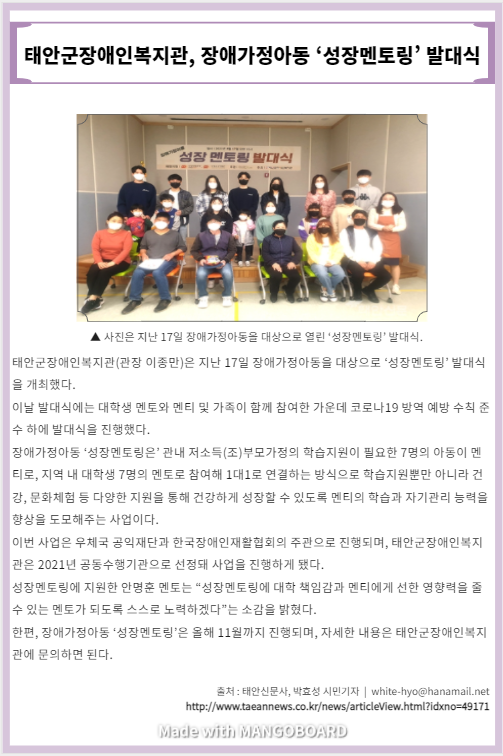 성장 멘토링 지원 사업 ' 발대식' 태안군장애인복지관 0 1646 2021.05.20 14:32 http://www.taeannews.co.kr/news/articleView.html?idxno=49171 + 889 출처 : 태안 신문사 2021. 4. 22. (http://www.taeannews.co.kr/news/articleView.html?idxno=49171)